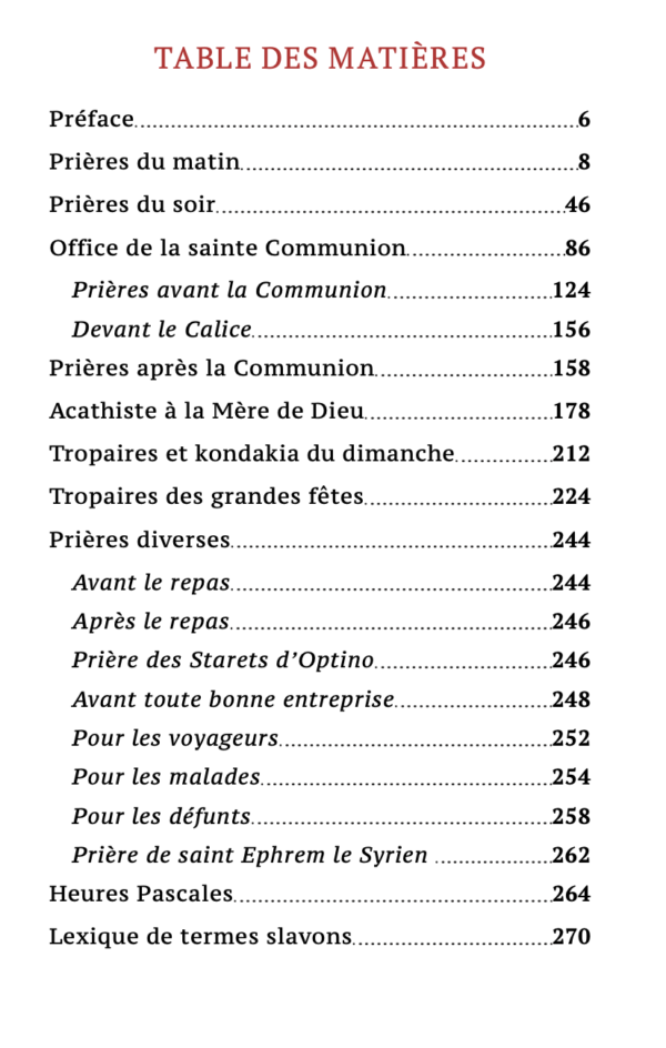 Les textes sont présentés dans une édition parallèle en slavon liturgique et en français.